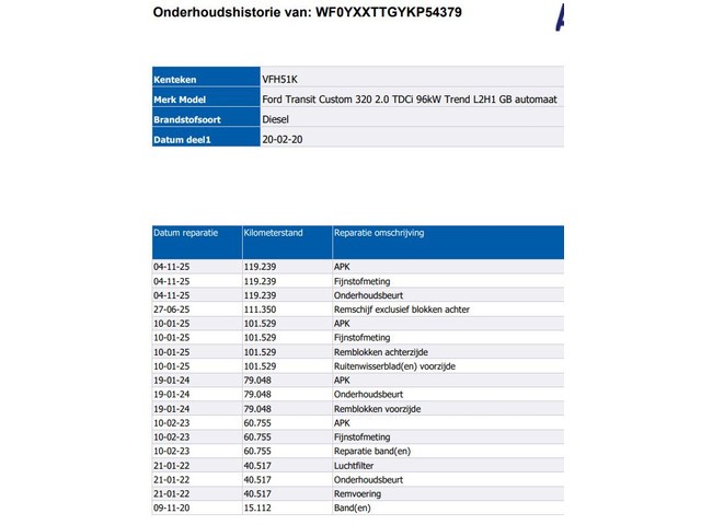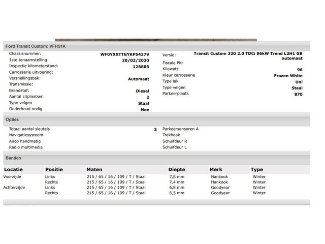 | Model Ford Transit Custom | Kenteken VFH-51-K |