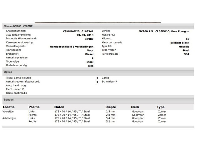 / Nissan NV200 1.5 dCi Visia Budget Edition excl. BTW €6.950 km-stand 183.447 km bouwjaar 9-2016 vermogen 66 kW (88 pk) transmissie Onbekend brandstof Diesel Autobedrijf Leemans Raamsdonkveer